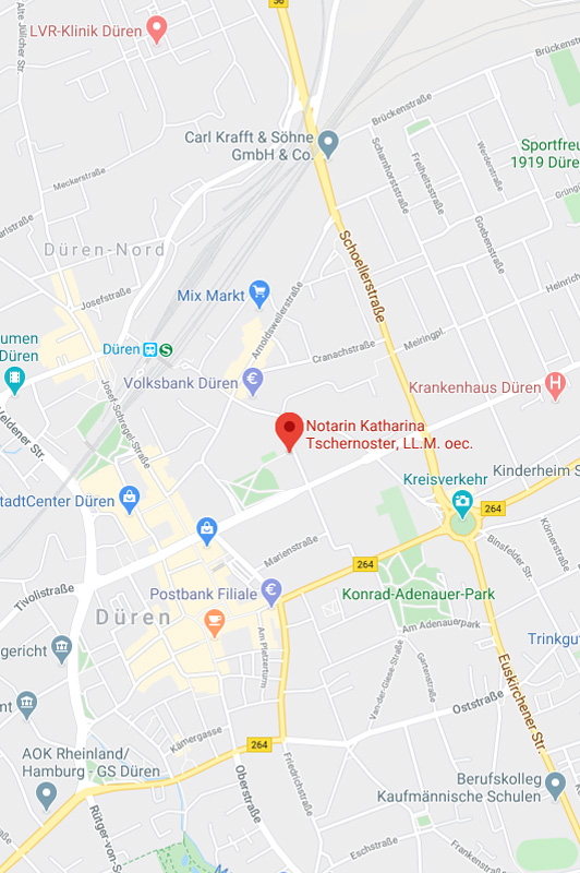 Die Geschäftsstelle befindet sich im 3.OG des Bismarck-Quartiers in Düren, Moltkestraße 45 (Stichweg zwischen dem Dorint Hotel und dem Wirteltor Gymnasium, direkt über dem Gesundheitszentrum MedAix). Parkmöglichkeiten stehen Ihnen in der hauseigenen Tiefgarage des Quartiers sowie an der öffentlichen Straße zur Verfügung. Das Notariat verfügt über einen barrierefreien Zugang und ist mit einem Aufzug (mit Zugang zur Tiefgarage) erreichbar.